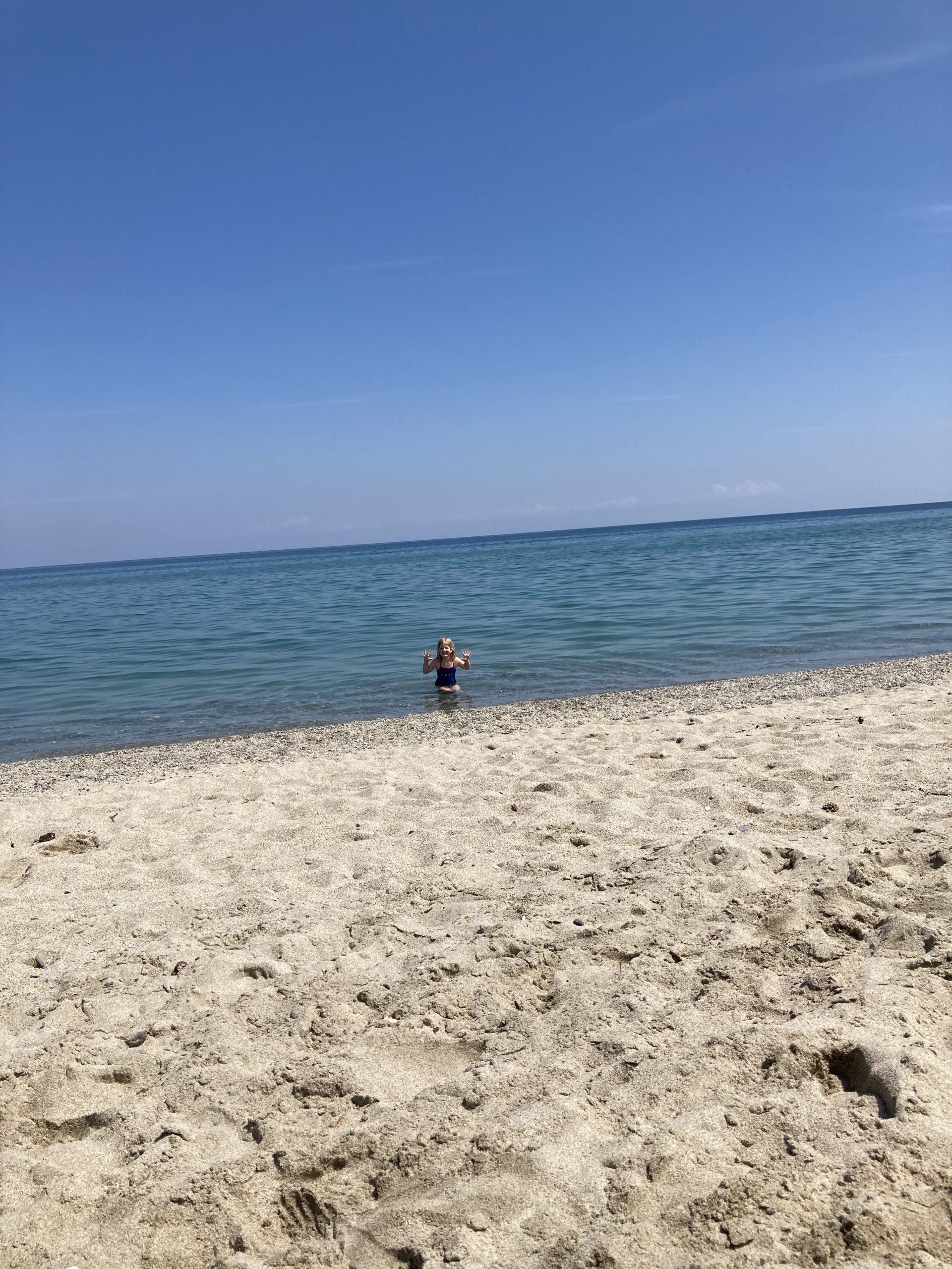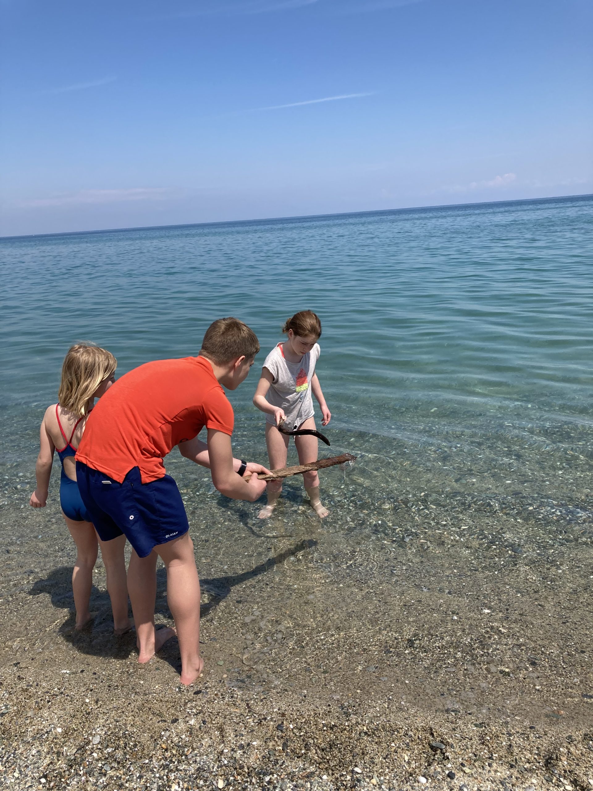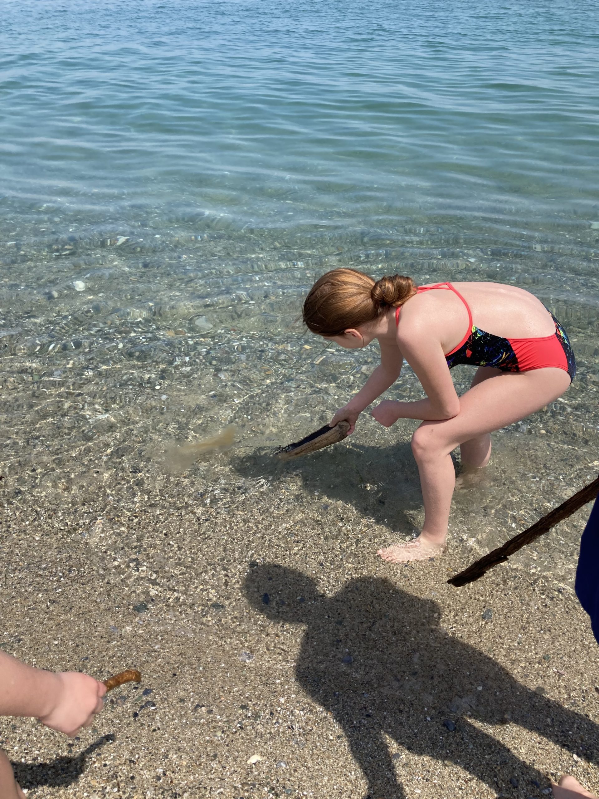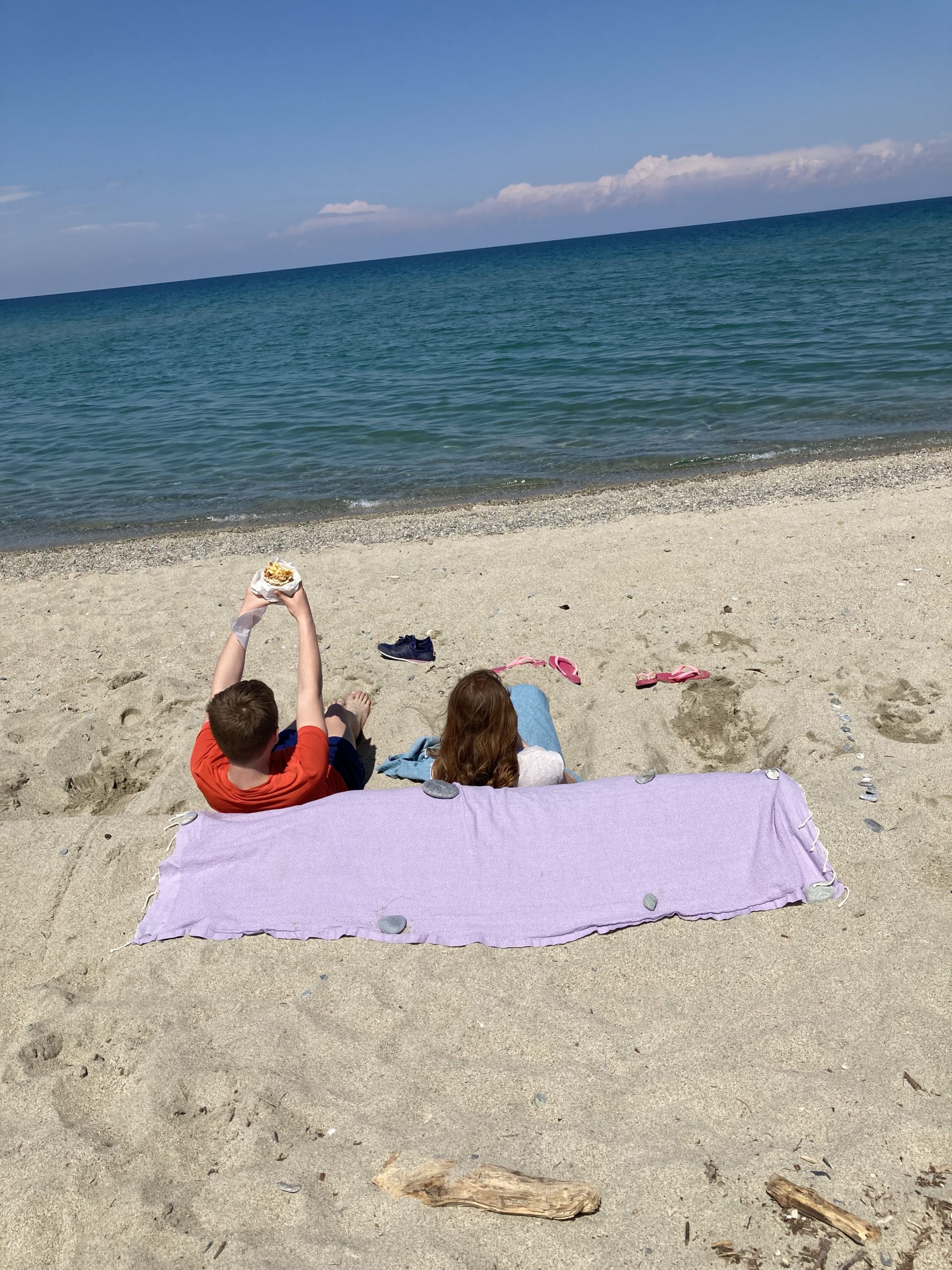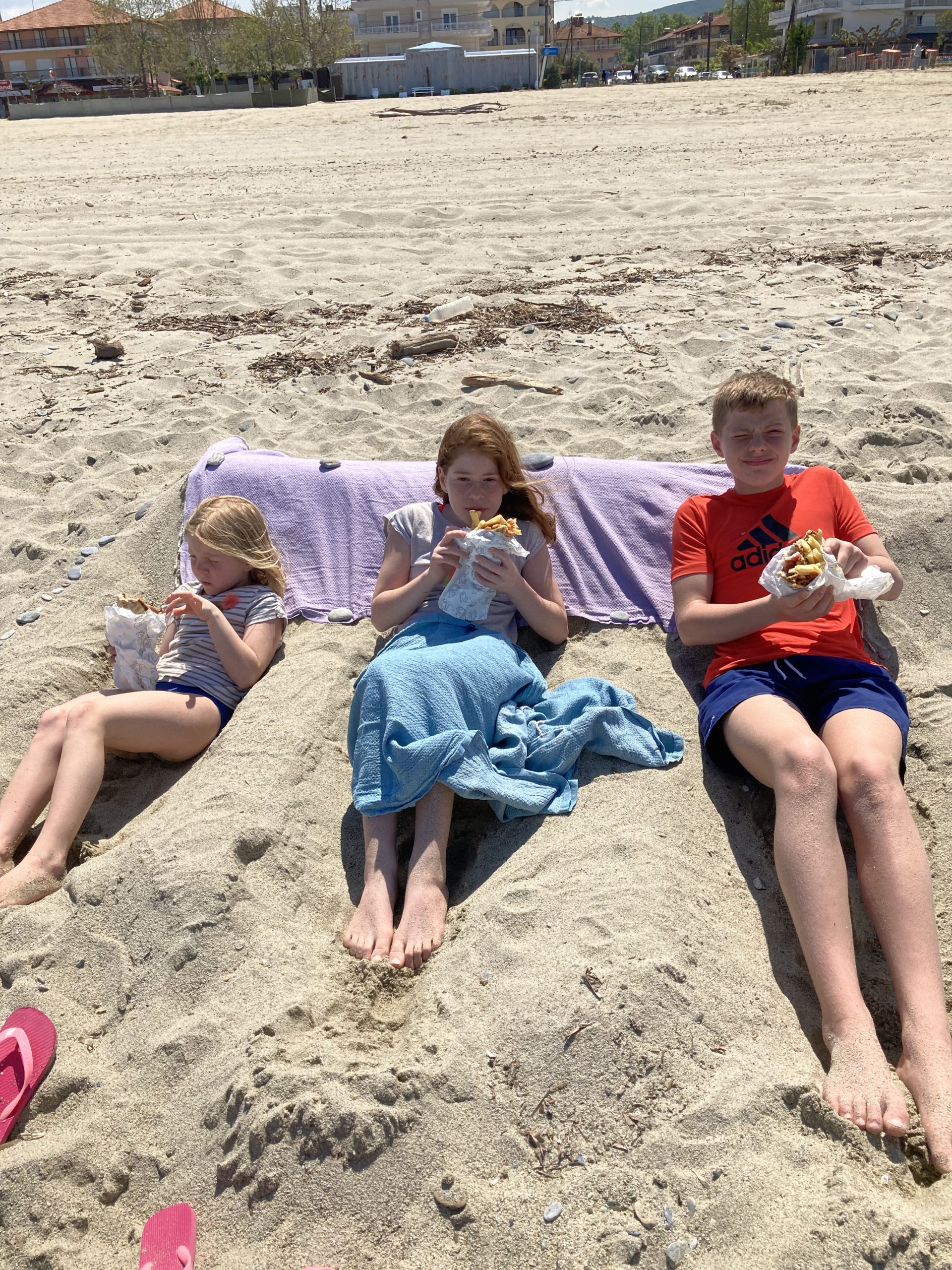 Ensuite nous sommes allés à la plage et nous avons pris des gyros, allongés sur notre canapé en sable, face à la mer, nous avons aussi fait des ricochets et attrapé des méduses !!!